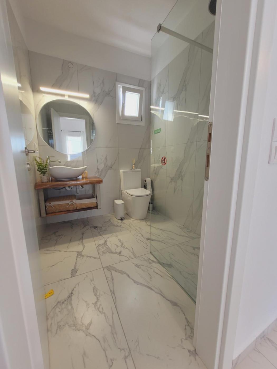 Two-Bedroom Apartment. Featuring a private entrance, this air-conditioned apartment comprises 1 living room, 2 separate bedrooms and 1 bathroom with a shower and a hairdryer. In the well-fitted kitchen, guests will find a stovetop, a refrigerator, kitchenware and an oven. Boasting a terrace with sea views, this apartment also provides a washing machine and a flat-screen TV. The unit offers 2 beds.