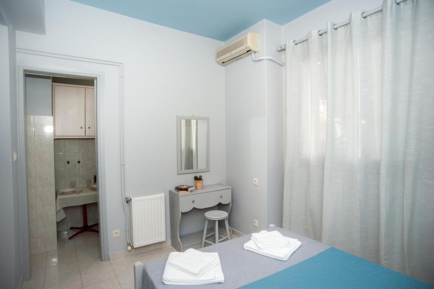 Basic Triple Room. The spacious triple room provides air conditioning, a wardrobe, as well as a private bathroom featuring a shower and a hairdryer. In the fully equipped kitchenette, guests will find a stovetop, a refrigerator, kitchenware and a toaster. Boasting outdoor furniture, this triple room also offers a safe deposit box, an electric kettle and a flat-screen TV. The unit offers 2 beds. ;