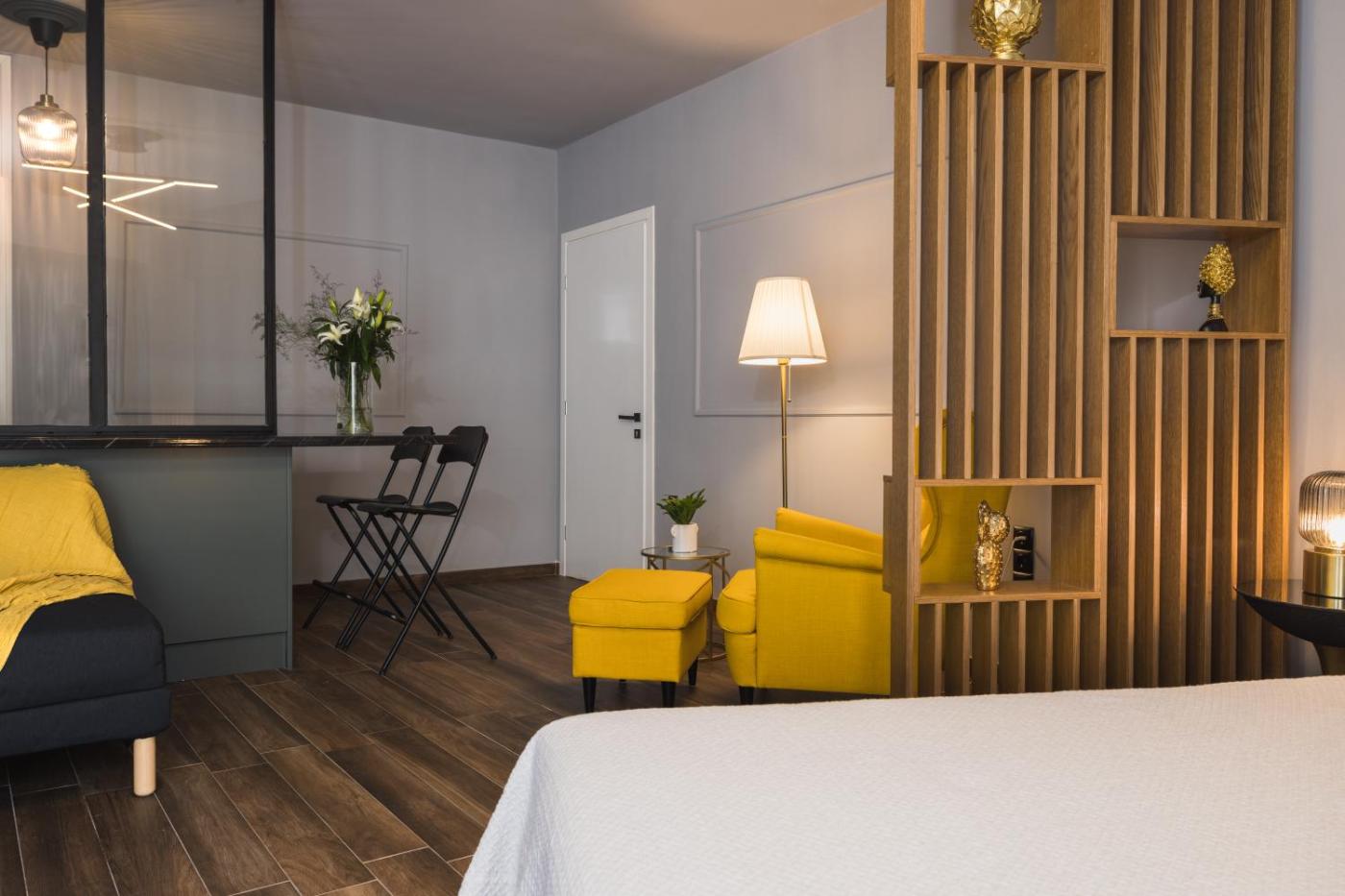 One-Bedroom Apartment. Boasting a private entrance, this air-conditioned apartment includes 1 living room, 1 separate bedroom and 1 bathroom with a shower and a bidet. The well-equipped kitchen has a stovetop, a refrigerator, kitchenware and an oven. Featuring a balcony with ancourtyard view, this apartment also offers a washing machine and a flat-screen TV with streaming services. The unit has 2 beds.