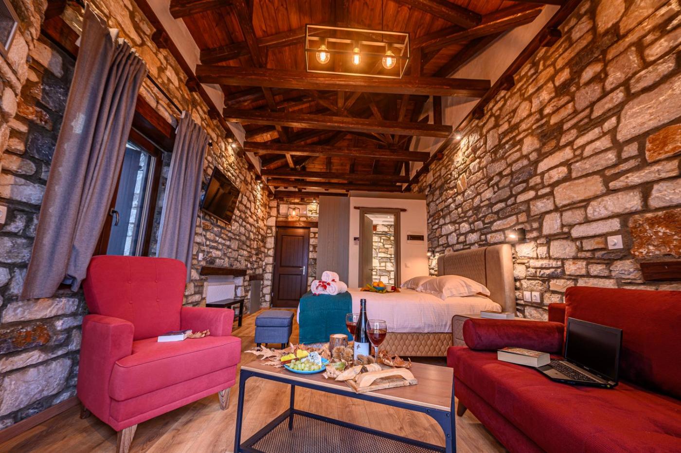 Superior Suite with Sea View. This suites special features are the hot tub and the fireplace. Featuring a private entrance, this air-conditioned suite comprises 1 living room, 1 separate bedroom and 1 bathroom with a walk-in shower and a hairdryer. Guests can make meals in the kitchen that is equipped with a stovetop, a refrigerator, kitchenware and a tea and coffee maker. Boasting a terrace with sea views, this suite also provides soundproof walls and a flat-screen TV. The unit offers 2 beds. ;