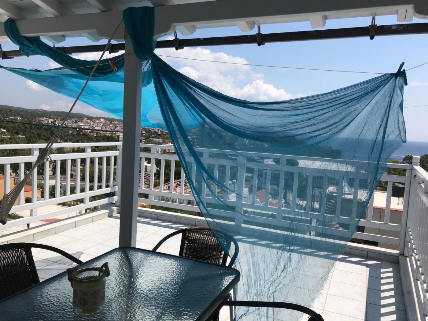 Apartment with Sea View. Offering Aegean Sea and mountain views from its furnished balcony, this air-conditioned apartment has a separate bedroom. It features a seating area with flat-screen TV and a kitchenette with mini fridge and dining table. ;